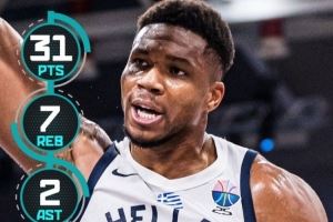 此役,希腊球星字母哥出战29分02秒,投篮20中14,罚球4中3,砍下31分7板2助1断,另有5次失误,正负值-3。