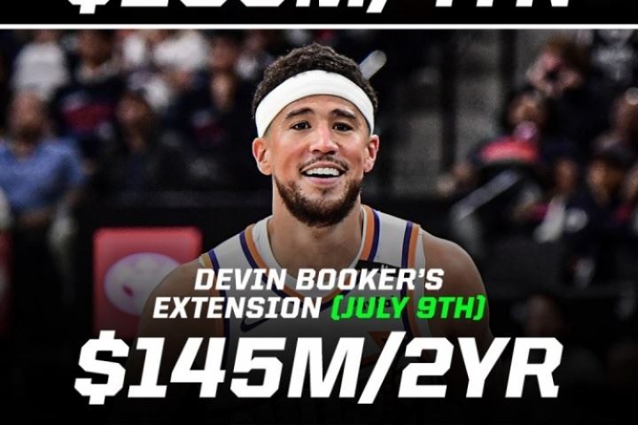 在亚历山大4年2.87亿提前续约雷霆后的第八天,布克2年1.45亿美元顶薪提前续约太阳。