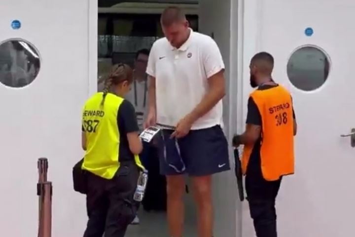 守规矩!约基奇观看热身赛慌忙掏证件😂乖乖等待核验