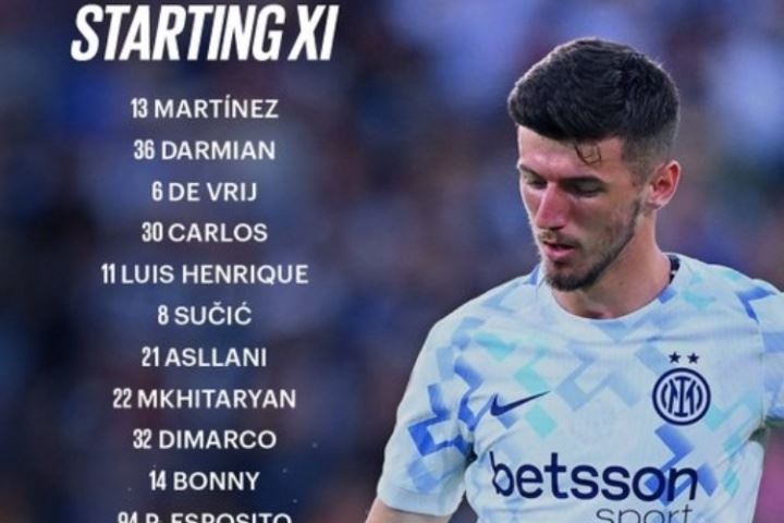 国米首发:13-何塞普-马丁内斯、36-达米安、6-德弗里、30-奥古斯托、8-苏西奇、1-阿斯拉尼、22-姆希塔良、32-迪马尔科、11-恩里克、14-博尼、94-F-埃斯波托尼