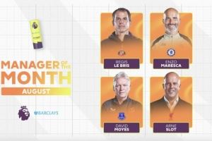 8月英超赛程,布里斯率领桑德兰取得2胜1负战绩;马雷斯卡率领切尔西取得2胜1平;莫耶斯的埃弗顿取得2胜1负;斯洛特带领切尔西取得3战全胜,是目前英超唯一全胜队伍。