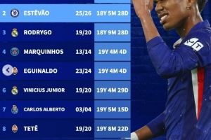 欧冠破门最年轻巴西球员榜:恩德里克居首,埃斯特旺次席